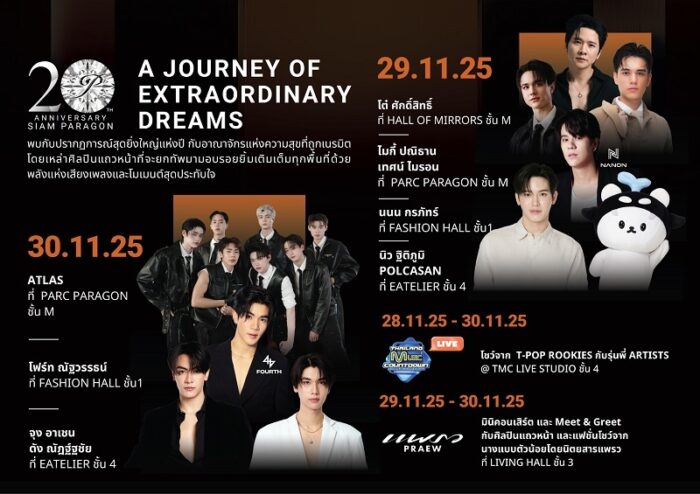 สำหรับผู้ชื่นชอบประสบการณ์สุดพิเศษ ตื่นตาตื่นใจกับ Sealife Water Dance ที่ Sealife Bangkok วันละ 2 รอบ และเพลิดเพลินกับการแสดงสุดพิเศษ Recycling Concerto ที่เปลี่ยนขยะให้เป็นเสียงดนตรี ณ พื้นที่ Nextopia ชั้น 5 พร้อมกันนี้เมเจอร์ ซีเนเพล็กซ์ ยังร่วมฉลองด้วยการจัดกิจกรรมพิเศษ “Paragon Cineplex Exclusive Movie Night” ระหว่างวันที่ 29-30 พฤศจิกายน 2568 ชมภาพยนตร์ฟรีรวม 2,000 ที่นั่ง รอบเวลา 20.00 น. พิเศษ! พบกับไฮไลท์สุดฟิน “Siam Paragon 20th Anniversary x PRAEW มินิคอนเสิร์ต , มินิทอล์ค และ Praew Meet and Read Special โดยนิตยสารแพรว ที่ยกขบวนศิลปินแถวหน้ามาสร้างรอยยิ้มแห่งความสุข ณ LIVING HALL ชั้น 3 ตลอด 2 วัน ทั้ง หยิ่น อานันท์-วอร์ วนรัตน์, ลีน่า ลลินา-หมิว ณัชชา, หลุยส์ ธณวิน-ฟอร์ด อรัญญ์-ฟลุ๊ค ณัฐนนท์, บิ๊ก ธนกร-ปาร์ค อนันตเดช, เชน ณัชพล-บอส ณัฐกิตติ์, กฤต รณกฤต-ตั๋ง ชินดิศ, อ็อตโต้ พชร-ลี อัสรี, บิลลี่ ภัทรชนน-เบ้บ ธนทัต, หล่งซื่อ ลี-อาร์ม ชัยภัทร, แม้ก กรธัสส์-ณฐ ณฐสิชณ์, มอส ภาณุวัฒน์-แบงค์ มณฑป, จา พชร-เต้ วีรภัทร, แพทริคอนันดา, Kob Flatboy, ICEACE, KJ, โฟกัส ญาณิน, Cheriie, กีต้าร์ สาริน, EARTHernative, faygo, HOWLS,วง SOUNDSLEEP, 5 สาว Sugar ‘N Spice, บอยกรุ๊ป LE7EL และ “Amazing Boy Thailand พร้อมแฟชั่นโชว์สุดน่ารักจากเหล่านางแบบตัวน้อย